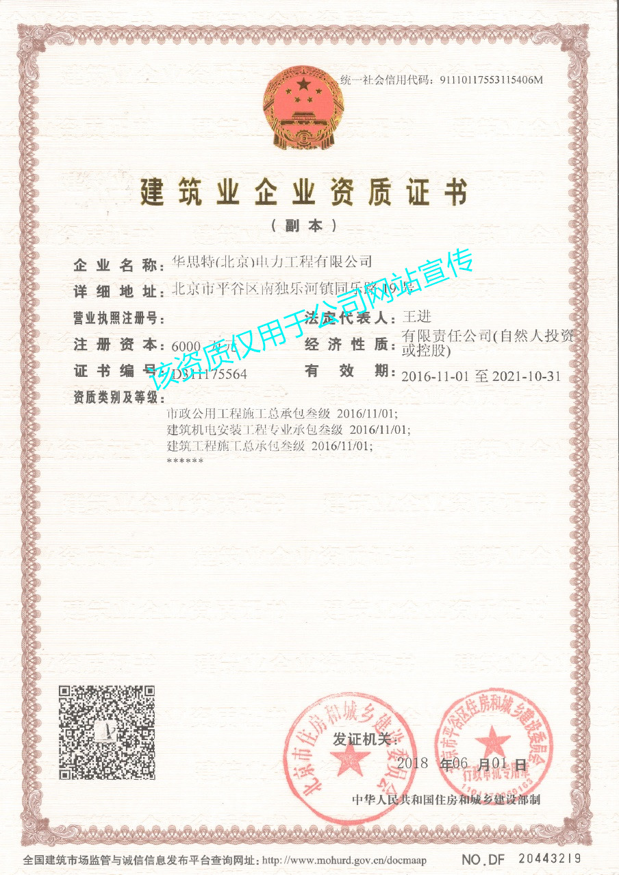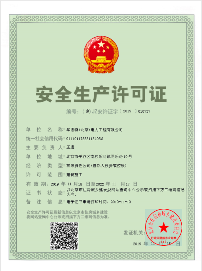 建筑工程施工總承包叁級(jí)。承裝(修、試)電力設(shè)施許可證